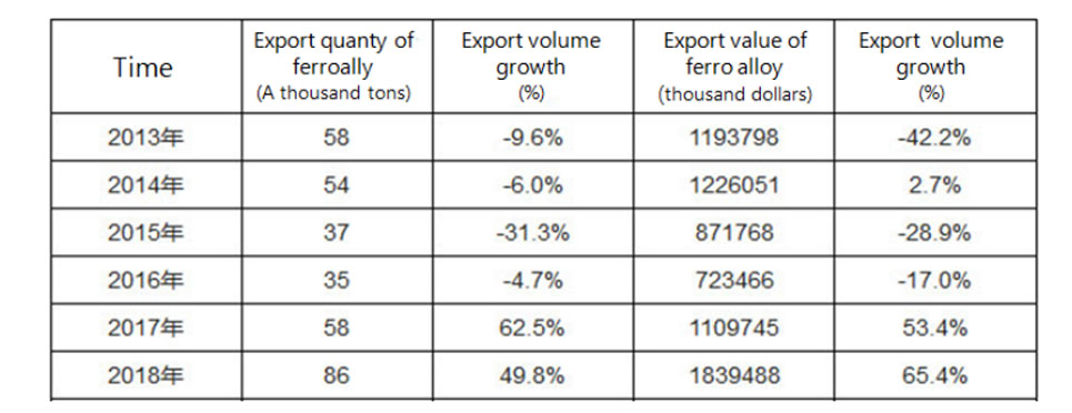 一、近两年来,由于中国的资源优势和政策支持,铁合金出口前景良好。这是2013年至2018年铁合金出口的统计表。